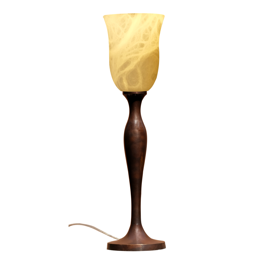 Eine sehr klassische Form, diese hier ist aber besonders elegant in der Linienführung und einem Alabaster Naturstein Schirm in Natur.